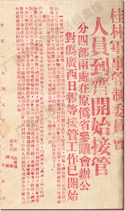 解放后,桂林、柳州、梧州、南宁等各大城市成立了军事管制委员会,接管国民党政权留下的各级机关、学校、银行、厂矿、医院及其人员、财物、档案等,实行军事管制,为建立新政权准备条件。