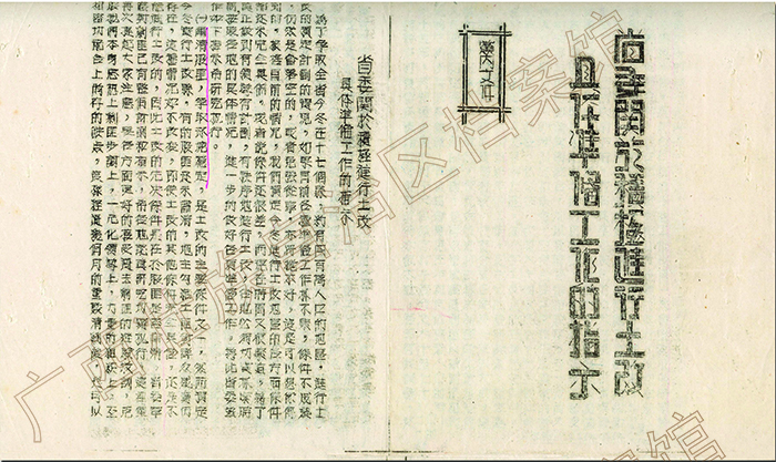 按照中共广西省委、省人民政府的部署,从1950年冬至1952年秋,分批完成了汉、壮族聚居地区的土地改革。侗、瑶、苗等少数民族聚居地区土改工作于1953年底进行试点,1954年5月结束。土地改革解放了农村生产力,极大地激 发了广大农民的生产积极性。