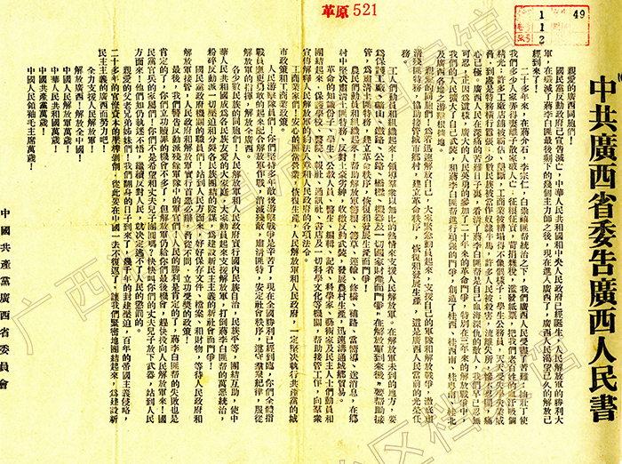 1949年9月,中共广西省委在武汉成立,11月30日,随解放大军到达桂林,随即领导广西各族人民建立各级人民政权,进行剿匪反霸、维护社会治安、恢复和发展生产,取缔卖淫嫖娼、贩毒吸毒、聚众赌博等各种丑恶现象,在很短的时间内就使广西发生了翻天覆地的变化。