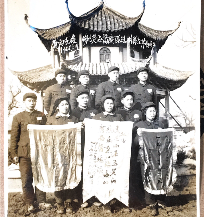 1954年广西省支援湖北灾区医疗队桂林分队全体队员合影,他们手里是当地群众赠送的锦旗。(照片来源:广西医科大学第一附属医院)