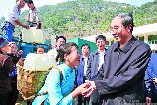 2月8日,自治区主席马飚赶往旱情严重的巴马瑶族自治县东山乡文钱村检查指导抗旱工作,并要求切实解决群众用水难,确保大石山区群众春节期间吃上“放心水”、过个“舒心节”。这是马飚主席在文钱村供水点亲手把一桶桶的水送到群众的手中、放进群众的背篓中。 记者何运斌/摄