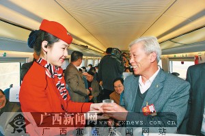 3月8日,在北京出席十一届全国人大二次会议的广西代表团部分代表,利用大会休息时间,搭乘“和谐号”动车组,体验京津高速铁路的运行情况。