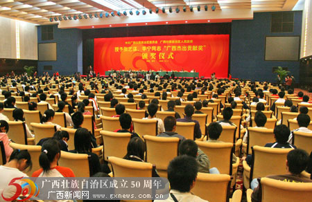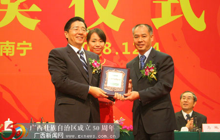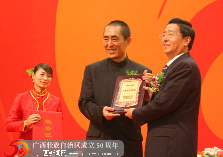 12月4日,在广西各族人民喜迎自治区成立50周年之际,中共广西壮族自治区委员会、广西壮族自治区人民政府授予著名导演、广西电影制片厂名誉厂长张艺谋,李宁体育用品有限公司董事长李宁“广西杰出贡献奖”,各奖励一百万元人民币。