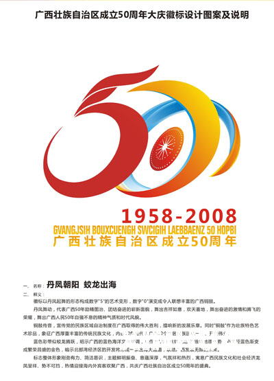 2008年是广西壮族自治区成立50周年大庆之年。广西此前在全国范围内征集自治区成立50周年大庆徽标和吉祥物。在规定的时间内,共收到全国各地329名设计者(个人或单位)提交的483件徽标作品、221件吉祥物作品,其中来自广西的徽标作品占所有徽标作品的47.62%,广西以外的徽标作品占总徽标作品数的52.38%;来自广西的吉祥物作品占所有吉祥物作品的53.39%,来自广西外的吉祥物作品占所有吉祥物作品的46.67%。