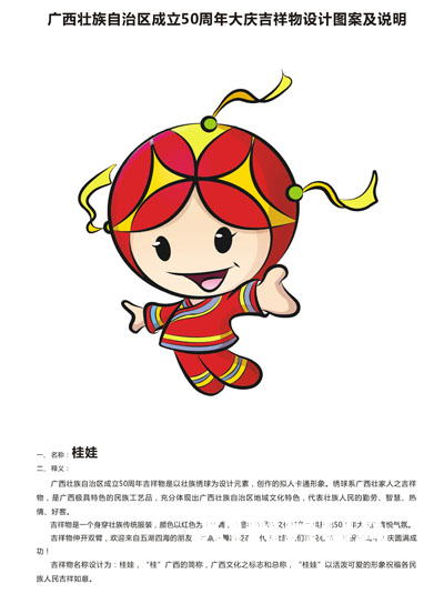 图为广西壮族自治区成立50周年大庆吉祥物《桂娃》的设计图案及说明。(9月18日摄)