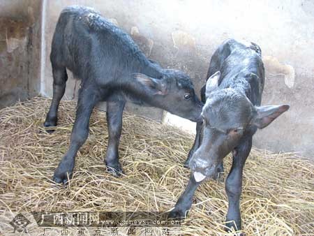 10日下午,在广西水牛研究所水牛场,一身黝黑的“明明”蹲坐在1号牛棚里,看到陌生人靠近,它慢慢直起身来,用滑溜溜的鼻子拱了拱记者的镜头。一旁,是同日诞生的小母犊“微微”,“微微”的母亲,是世界首例性别控制试管水牛孪生姐妹之一的“欢欢”。两头小牛犊不时贴在一起,相互摩挲。水牛场一名负责人称,两只小牛犊至今状况良好。