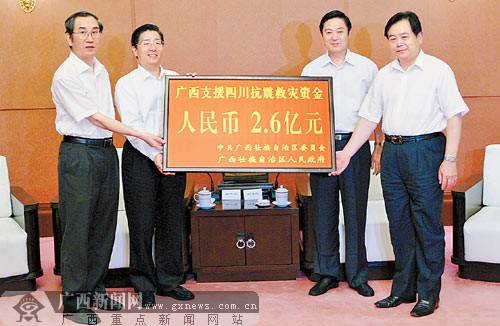 “四川广西心连心,广西四川一家人。虽然中央没有给广西安排对口支援任务,但如果四川人民有需要,我们将尽最大努力给予支持援助,共同夺取抗震救灾斗争的全面胜利!”