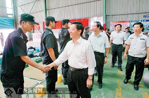 7月9日下午,自治区领导郭声琨、马飚等来到四川省绵阳市安县,亲切看望并慰问在这里执行社会治安维稳任务的广西公安特警。 记者 刘 宇/摄