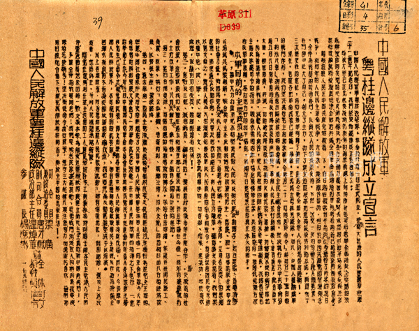 ,中国人民解放军粤桂边纵队成立,发布宣言宣告