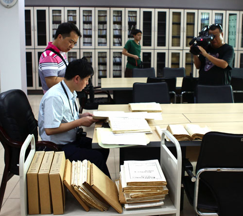 中国兵器江南集团寻访小组在柳州市档案馆翻阅档案,柳州电视台摆古栏目记者进行现场拍摄