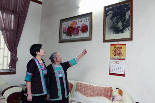 吴英花向客人讲述她当年向毛泽东主席献花的情景(廖文清摄)