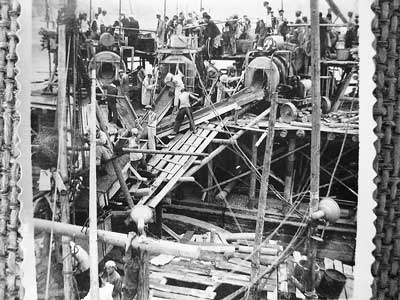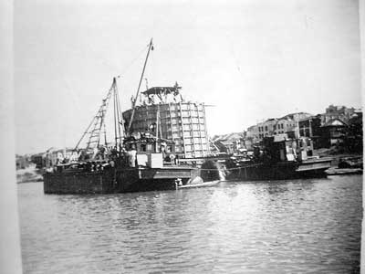 当时没有高扬程的抽水机,深水处沉井内的水是没有办法抽出来的,而沉井内的水抽不出来,建设者就无法将井内的泥沙挖出。于是大家就用2至3个低扬程的水泵连接起来往外抽水,抽水的问题就这样解决了。解决了抽水问题,新问题又出现了,在浇注水下混凝土时,必须将搅拌机放在相当高处才有压力将混凝土在水下分布均匀,否则就会成为豆腐渣工程。但由于当时没有混凝土输送泵,这一项工作很难完成。于是建设者们就创造性地在船上搭建起一定高度的平台,然后在平台上搅拌混凝土,往下浇注(图④)。
