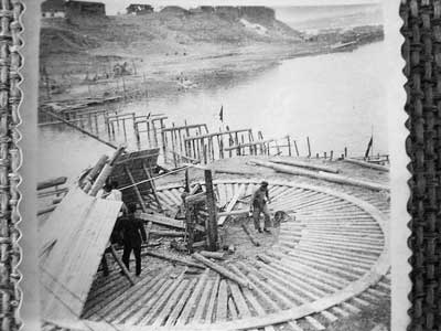 摆在面前的困难,并不能吓倒干劲冲天的建设者。他们凭着一股“韧劲”战胜了一切困难,同时也创造了许多“奇迹”。说着,陈队长特意挑出几张老照片递给记者。记者看到,在修建桥墩时,如果是水浅处就筑人工沙岛,在上面浇筑好混凝土沉井,然后往下沉;而如果桥墩位置在深水处,则是在岸上浇注好薄壳沉井,封好底,浮运到桥墩位置,拆去底板往下沉(图①②)。由于没有吊装的机械设备,当时的建设者们集思广益,自己动手创造了木制独臂摇头把杆(图③),用人工绞车来吊装各种机器、材料,以及大量的泥沙和混凝土。
