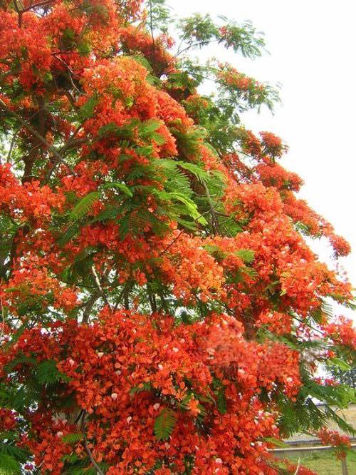 凤凰树又叫红花楹树、火树、红花楹 、影树、金凤。属落叶乔木,高10-20米。二回羽状复叶长20-60厘米,有羽片15-20对,羽片长5-10厘米,有小叶25-28对;小叶密生,细小,长圆形,长4-8毫米,两面被绢毛,顶端钝。伞房式总状花序顶生和腋生;花大,直径7-10厘米;花冠鲜红色至橙红色,具黄色斑。夏季为开花期,开花后结出一条条长形豆荚果,长可达60厘米,成熟后呈深褐色,木质化,内藏40-50粒细小的种子,每颗平均只有0.4克重,种皮有斑纹,有毒,不可误食。用手摇动干豆荚会发出“拆拆拆”的响声,南宁人称为“戚拆豆”(音)。