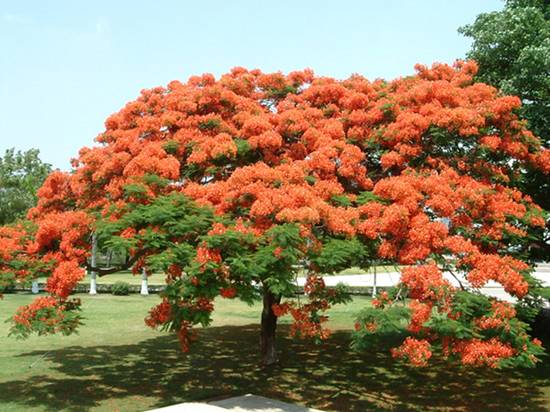 凤凰树常见于庭园或为行道树。原产非洲 。台湾、海南、福建、广东、广西、云南等省区有引种栽培。