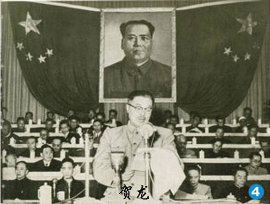 图为贺龙副总理代表中共中央、国务院和毛主席向大会致贺词