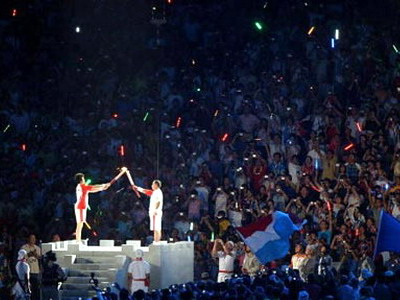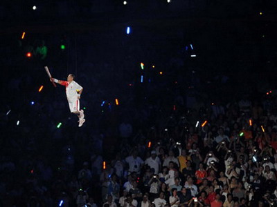 当2008年8月8日晚举行的北京奥运会开幕式上进行到最激动人心的点火环节时,“体操王子”李宁众望所归的出现在火炬传递的最终点。只见他高擎着手中被点燃的火炬,徐徐上升,环绕奔跑在国家体育场的空中。一幅“祥云”卷轴随着他前进的步伐徐徐展开,在奔跑的尽头——主火炬塔下,李宁凝神矗立,随后点燃了奥运圣火,霎时间焰火、欢呼同时喷涌而出,开幕式达到最高潮!
