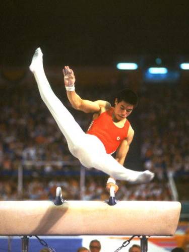 最好成绩——1984年洛杉矶奥运会上独得鞍马、自由体操和吊环三枚金牌,图为他在鞍马比赛中。