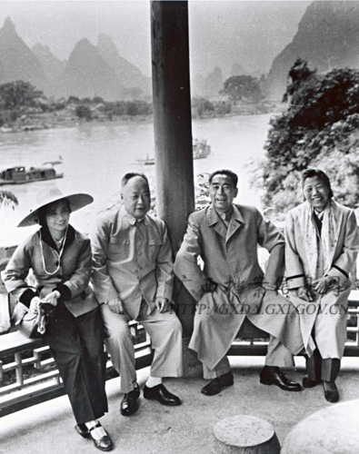 月,周恩来、陈毅、邓颖超、张茜在阳朔碧莲峰亭中合影。