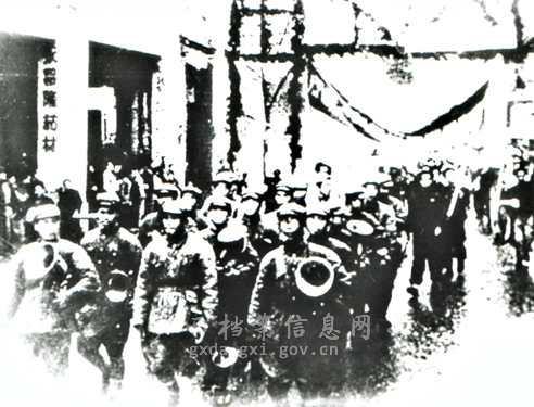 ,南宁军民游行庆祝解放。图为前导的解放军乐队。