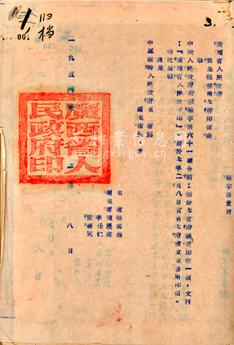 ,广西省人民政府为政府成立启用印信向中原临时人民政府的报告。