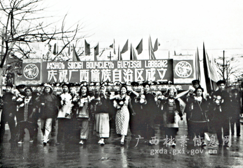 ,南宁群众举行盛大游行,庆祝广西壮族自治区成立。