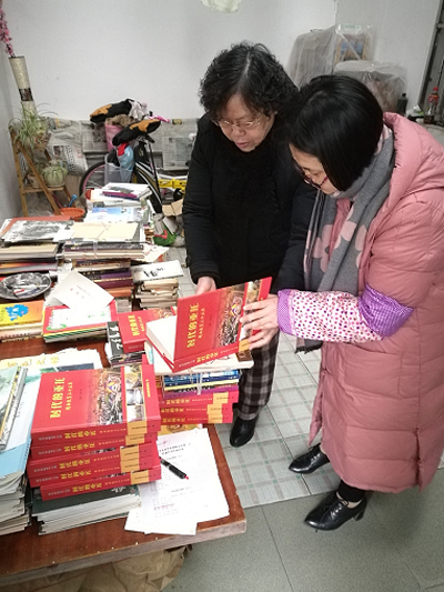 图为百色市档案局韦咏梅副局长(图右)在黄碧功主席(图左)家中查看捐赠图书情况