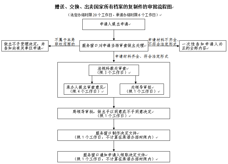 | 2 | 行政许可 | 向国内外的单位和个人赠送、交换、出卖档案复制件的审批 | 【法律】《中华人民共和国档案法》第十七条第三款“档案复制件的交换、转让和出卖,按照国家规定办理。” 【行政法规】《中华人民共和国档案法实施办法》(1990年10月24日国务院批准1990年11月19日国家档案局第 1 号令发布。1999年5月5日国务院批准修订1999年6月7日国家档案局第5号令重新发布。)第十八条第三款“各级各类档案馆以及机关、团体、企业事业单位和其他组织为了收集、交换中国散失在国外的档案、进行国际文化交流,以及适应经济建设、科学研究和科技成果推广等的需要,经国家档案局或者省、自治区、直辖市人民政府档案行政管理部门依据职权审查批准,可以向国内外的单位或者个人赠送、交换、出卖档案的复制件。” |