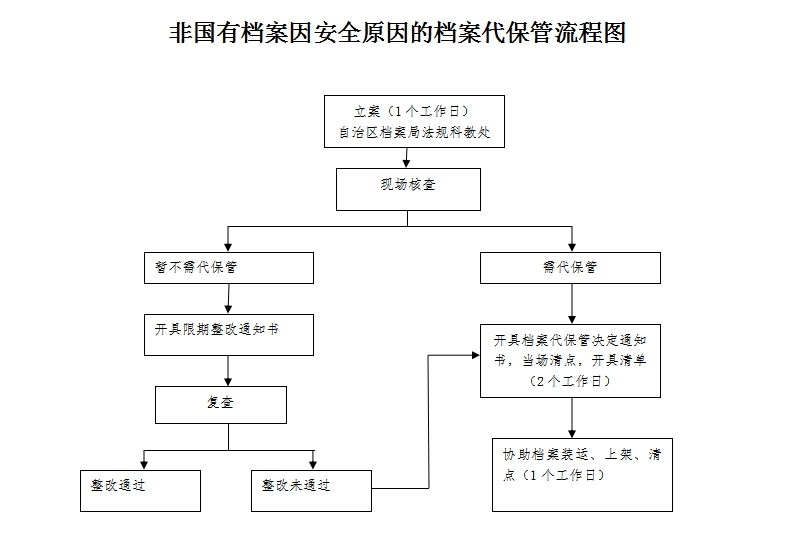 | 6 | 行政强制 | 非国有档案因安全原因的档案代保管 | 【法律】《中华人民共和国档案法》第十六条第一款“集体所有的和个人所有的对国家和社会具有保存价值的或者应当保密的档案,档案所有者应当妥善保管。对于保管条件恶劣或者其他原因被认为可能导致档案严重损毁和不安全的,国家档案主管部门有权采取代为保管等确保档案完整和安全的措施;必要时,可以收购或者征购。” | 个人,法人,其他组织 | 自治区档案局 法规科教处 |