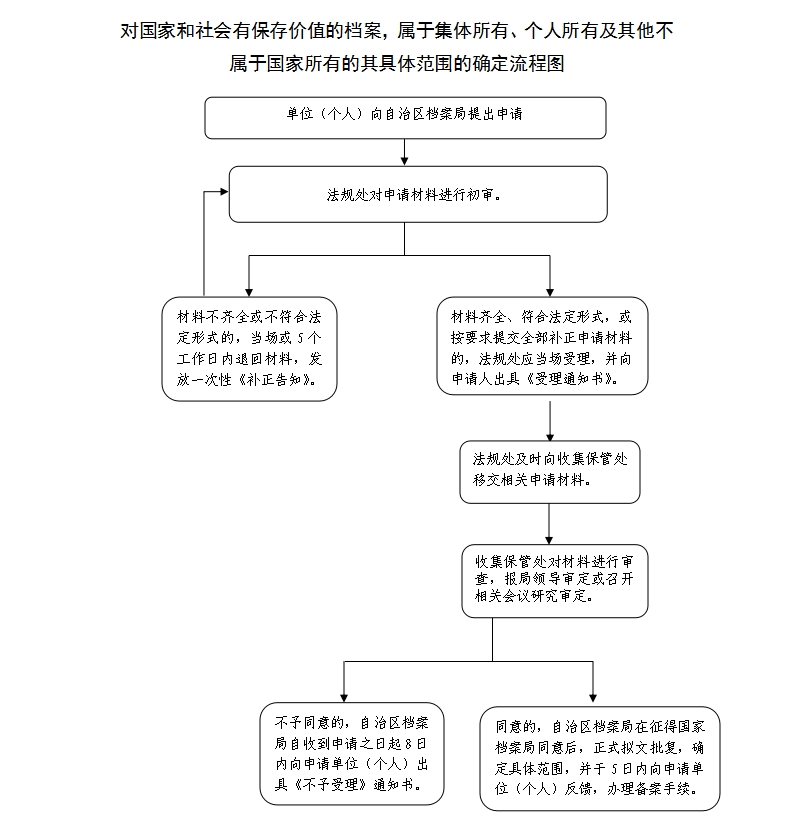 | 9 | 行政确认 | 对国家和社会有保存价值的档案,属于集体所有、个人所有以及其它不属于国家所有的,其具体范围的确定 | 【行政法规】《中华人民共和国档案法实施办法》(1990年10月24日国务院批准1990年11月19日国家档案局第 1 号令发布。1999年5月5日国务院批准修订1999年6月7日国家档案局第5号令重新发布。)第二条《档案法》第二条所称对国家和社会有保存价值的档案,属于国家所有的,由国家档案局会同国家有关部门确定具体范围;属于集体所有、个人所有以及其他不属于国家所有的,由省、自治区、直辖市人民政府档案主管部门征得国家档案局同意后确定具体范围。 | 个人,法人,其他组织 | 自治区档案局 法规科教处 |