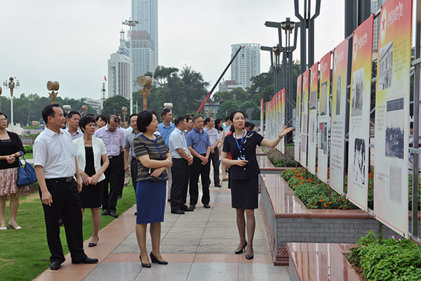 自治区直属机关工委常务副书记邓金玉(居中)出席《红星照耀中国—外国记者眼中的中国共产党人》民主广场巡展活动并参观展览