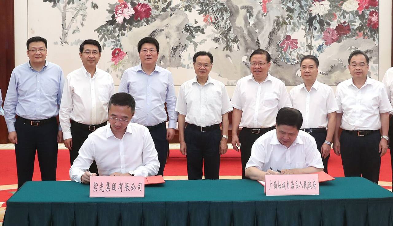 9月4日,自治区政府与紫光集团在南宁签署战略合作框架协议,共同推进数字广西建设,促进广西信息产业发展。自治区主席陈武会见紫光集团董事长赵伟国,并一同见证协议签署。梁凯昌/摄
