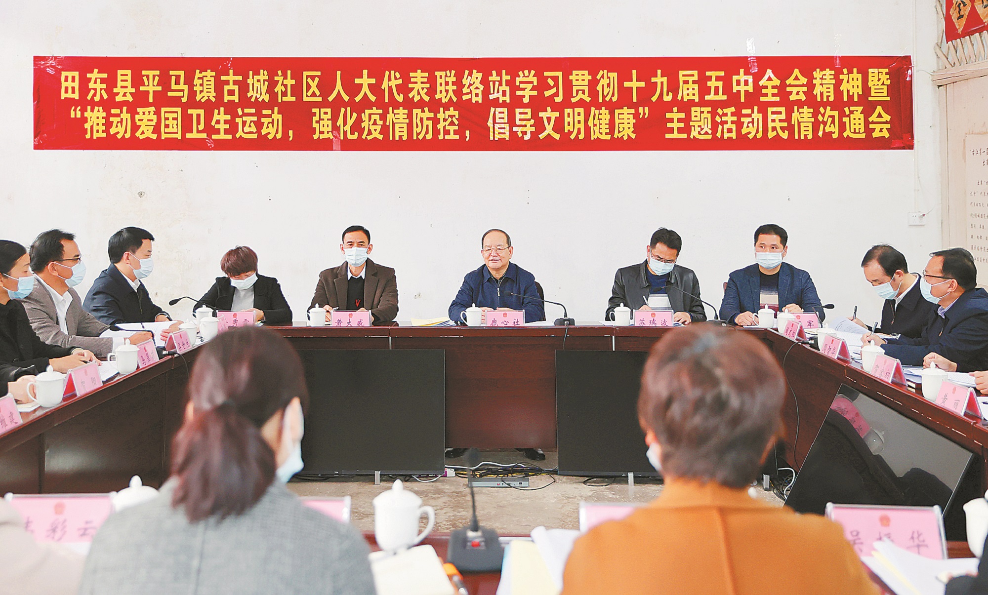 在人大代表民情沟通会上,会议通报了上一年度人大代表联络站重点建议办理情况,对联络站重点建议办理情况和开展活动情况进行满意度测评,田东县书面汇报开展公共卫生事业建设和新冠肺炎疫情防控工作情况。部分驻站人大代表和基层群众代表围绕“推动爱国卫生运动,强化疫情防控,倡导文明健康”主题,就移民集中搬迁区公共卫生等基础设施建设、城乡环境综合整治、开展爱国卫生运动和常态化疫情防控工作,以及《广西壮族自治区爱国卫生条例(草案)》等提出意见建议,自治区和田东县有关部门作了回应。鹿心社认真听取发言,要求有关部门认真梳理研究代表和群众提出的意见建议,结合工作实际,抓好落实。