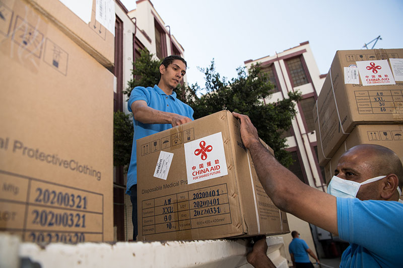 2020年5月10日,在埃及首都开罗,工作人员搬运中国政府援助的抗疫物资。新华社记者 邬惠我 摄