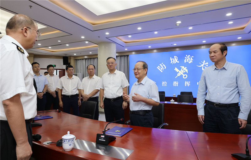在防城海关三级监控指挥中心,鹿心社通过视频系统了解边境口岸以及境外船舶、船员疫情防控工作。黄克/摄