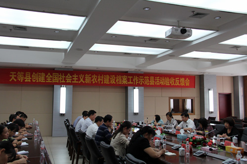 10月23—24日,以西藏自治区档案局副局长王政为组长的国家验收小组采取听取汇报、查阅资料、现场抽查、综合评议打分、召开反馈会的方式,对天等县创建全国社会主义新农村建设档案工作示范区进行了检查验收。验收组对天等县示范创建工作给予了充分的肯定:天等县党委、政府高度重视,创建工作保障有力;档案部门业务指导深入,创建工作扎实有效;涉农部门积极配合,创建工作整体联动;乡镇档案工作管理有序,创建工作稳步推进;村级档案工作水平提升,创建工作成效显著。目前,全县13个乡(镇)均建立了综合档案室,达到广西县直机关一、二级档案标准;行政村建档率达100%;124个行政村(社区)配备了电脑,实现了网络加光盘、纸质复印形式的农村档案信息资源共享,全县新农村建设档案信息资源共享体系基本形成。国家验收组认为天等县创建全国社会主义新农村建设档案工作示范县已达到国家验收标准,一致同意通过验收。希望天等县委、县政府一如继往地继续加强对新农村建设档案工作的领导和支持,使新农村建设档案工作在为农村经济建设和城乡统筹发展中发挥更大的作用。