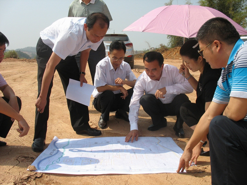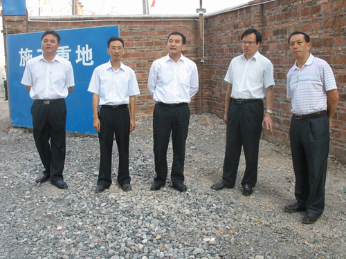 自治区档案局局长黎富文(右三)在蒙山县委书记秦金敏(右二)、梧州市档案局局长宁波(右四)、县委常委、办公室主任申学明(左一)、蒙山县档案局局长谢振华(右一)陪同下到蒙山县档案新馆建设工地现场指导工作。