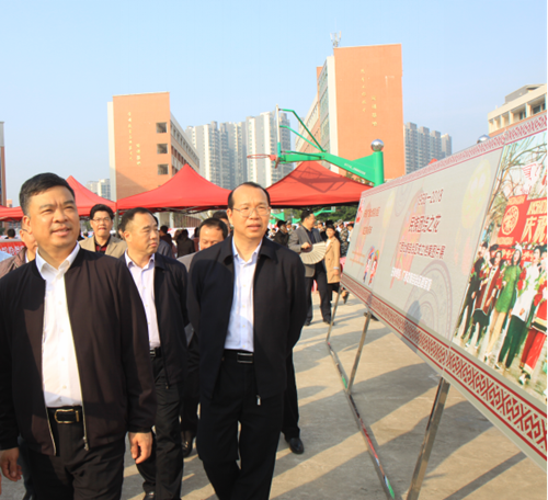 自治区档案局副局长农民智(右一)和梧州市委常委、政法委书记文建中(左一)等领导干部、群众参观《民族团结之花--广西壮族自治区成立档案图片展》