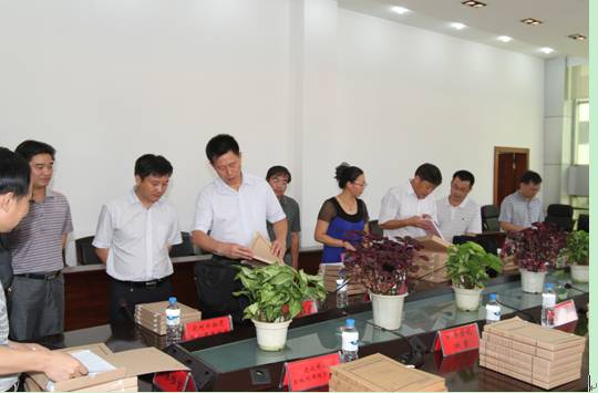 预验收组查看档案资料(左四为预验收组组长、广西区档案局胡冬林副局长,左三为恭城县林武民县长)。