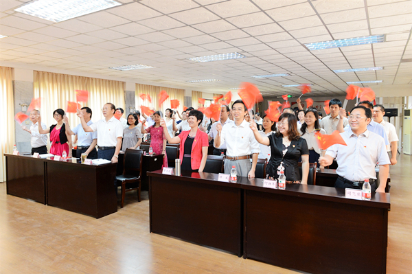 干部职工激动的挥舞五星红旗