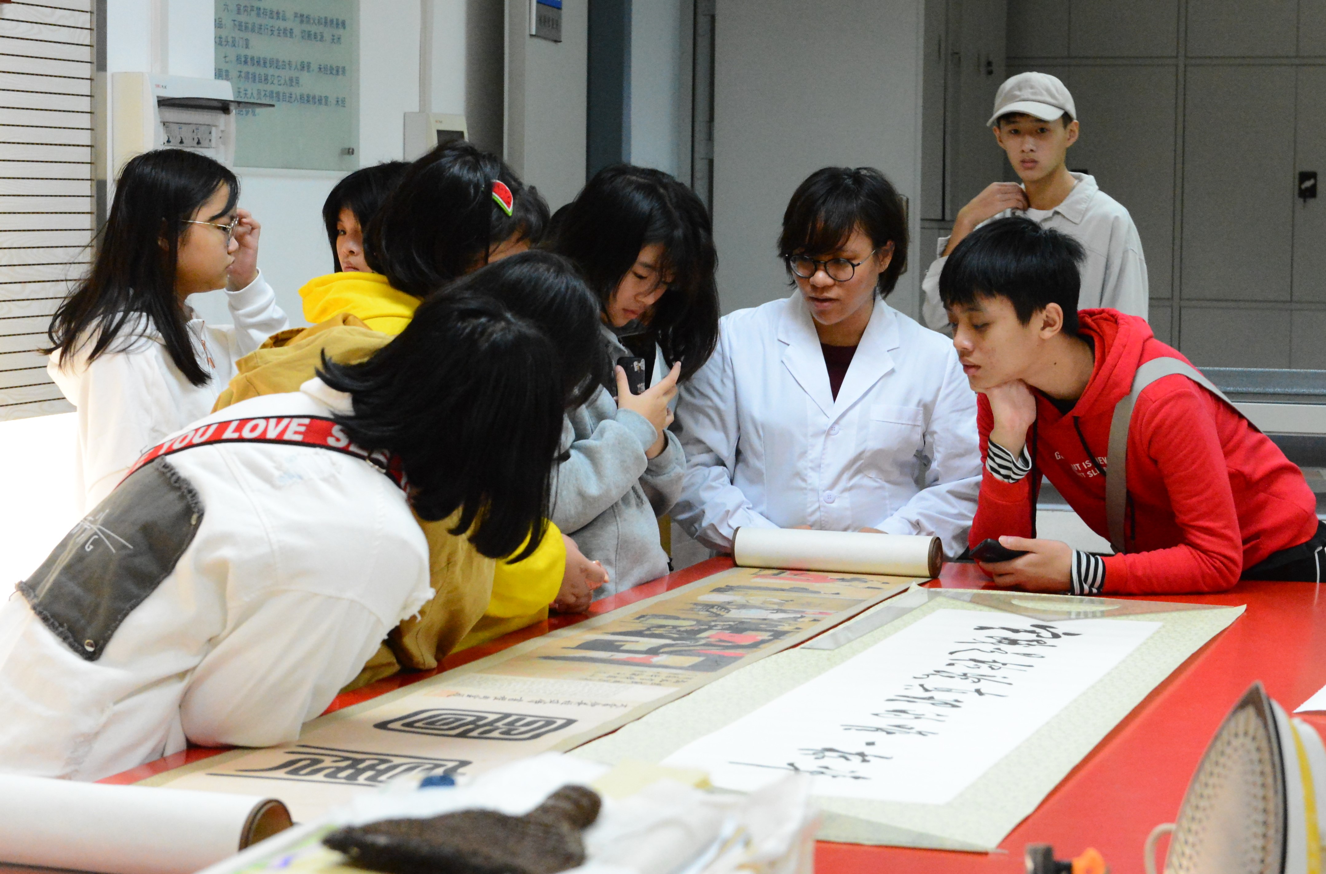 参加“工艺讲堂”的学生在观看档案修裱流程