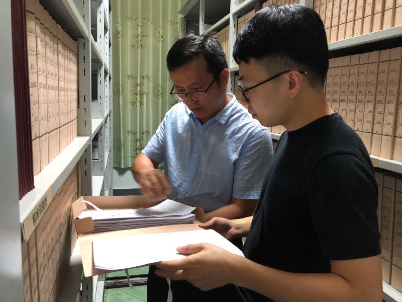 广西壮族自治区档案局和永乐汇的同志在广西精准扶贫档案室查看精准扶贫档案归档情况