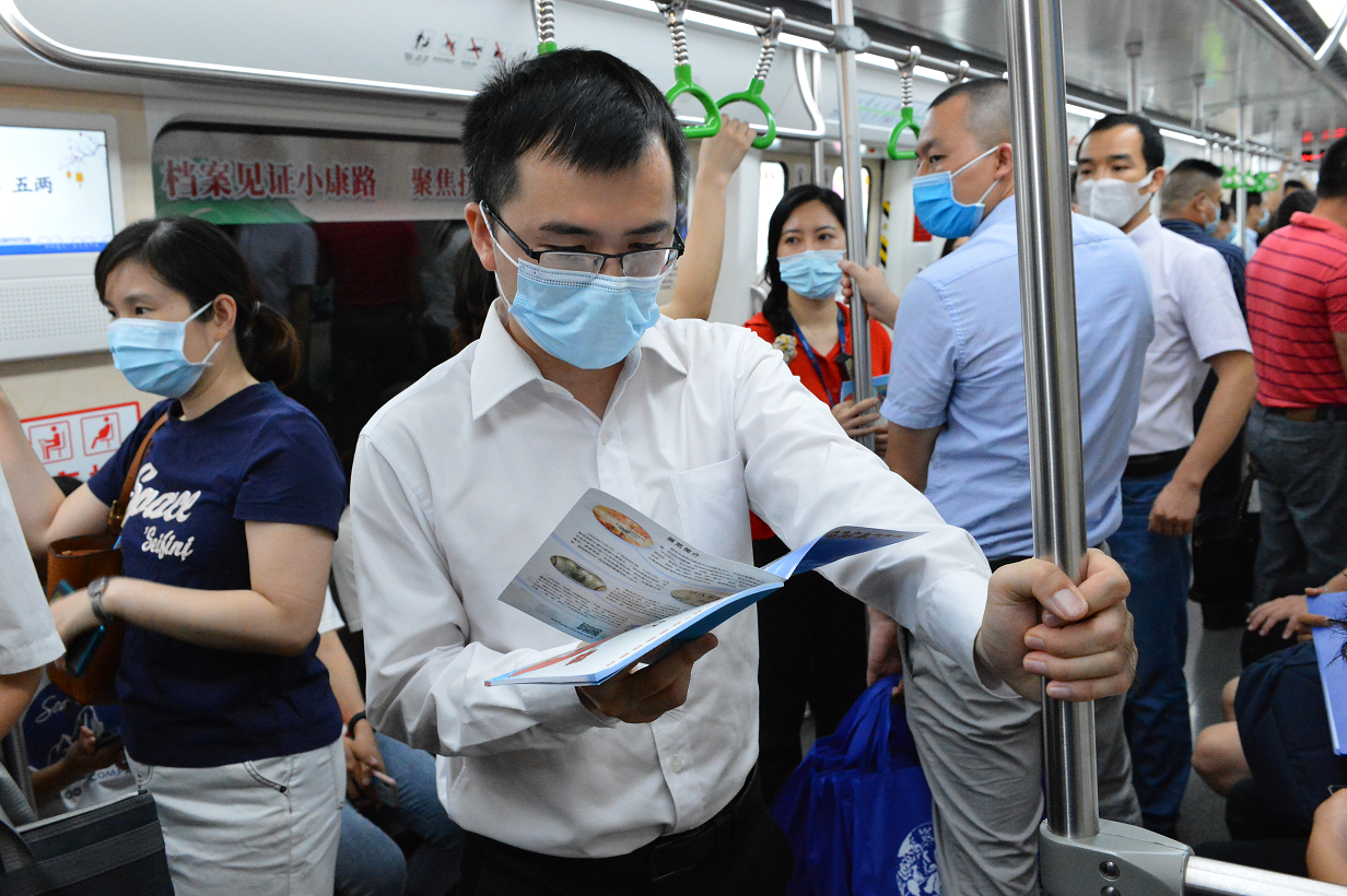 地铁专列乘客在阅读档案宣传资料