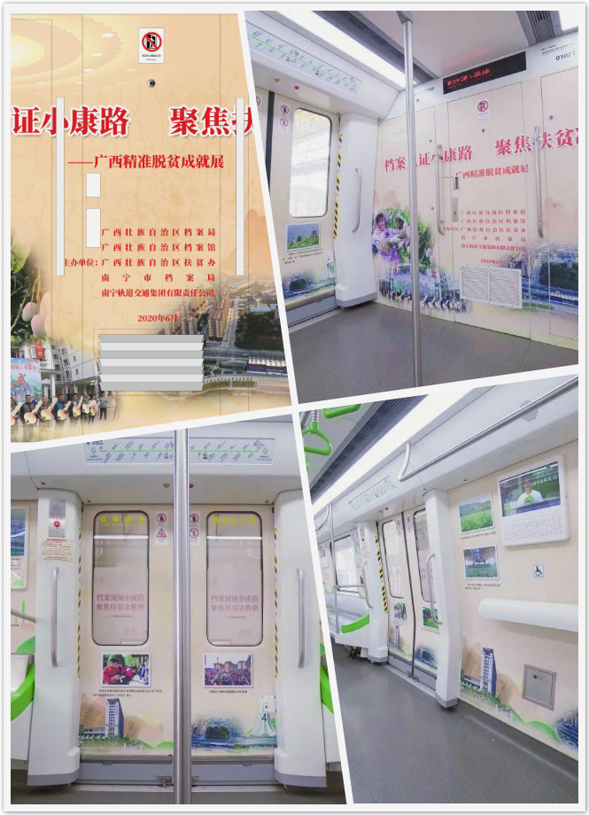 6月9日当天,由自治区档案局、自治区档案馆、自治区扶贫办、南宁市档案局、南宁轨道交通集团有限责任公司联合打造的“档案见证小康路、聚焦扶贫决胜期”地铁宣传专列在南宁轨道交通1号线首发。该专列通过撷取时代楷模黄文秀扶贫剪影、毛南族整族脱贫成果等一组组真实的档案图片资料,依托地铁这一流动“展厅”,为广大市民展现全区各族人民在以习近平同志为核心的党中央坚强领导下,攻坚克难,砥砺前行,在精准扶贫、精准脱贫方面取得的丰硕成果及生动感人的场景。以激发八桂儿女感恩党、跟党走,咬定目标不放松,坚决克服新冠肺炎疫情影响,坚决夺取脱贫攻坚战全面胜利!地铁专列将展示1个月,预计受众面约有30多万名乘客。