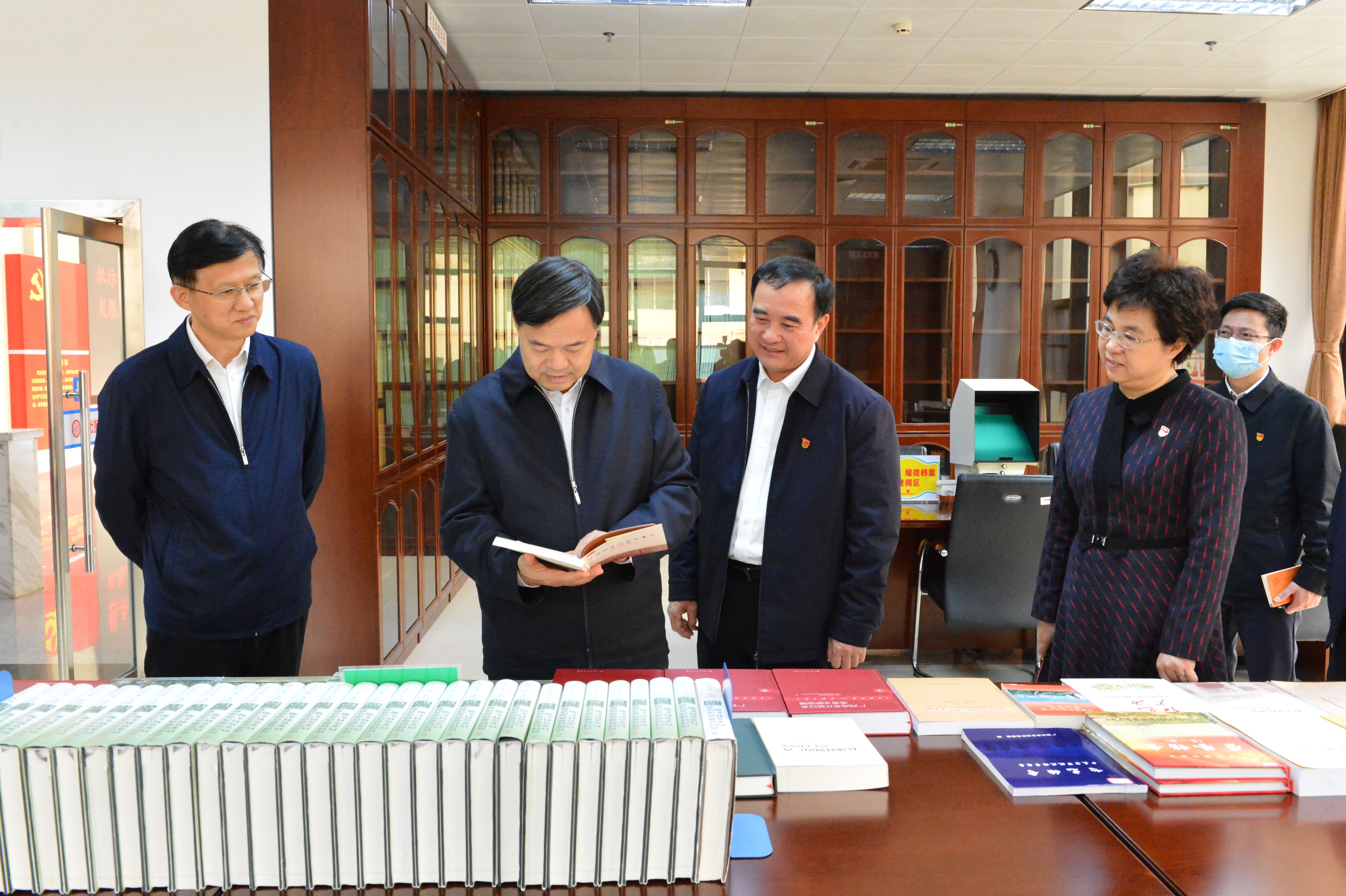 广西壮族自治区党委常委、秘书长周异决(右二)在自治区档案局了解档案宣传工作情况。(黄克 摄)