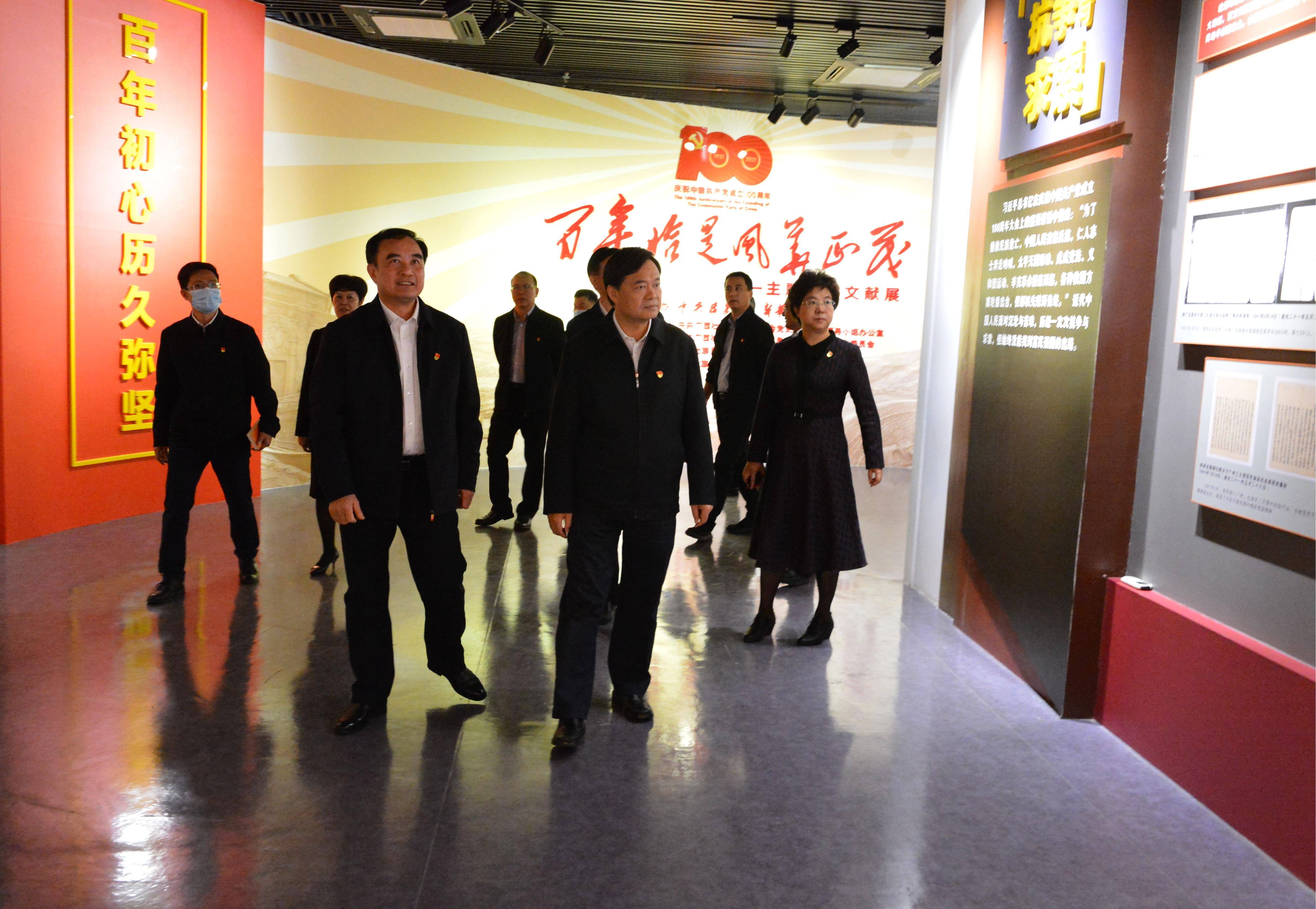 广西壮族自治区党委常委、秘书长周异决(中),自治区党委副秘书长、办公厅副主任、自治区档案局局长宁玉琼(右),自治区档案馆馆长黎富文(左)等领导参观“百年恰是风华正茂”主题档案文献展。(丘革灵 摄)