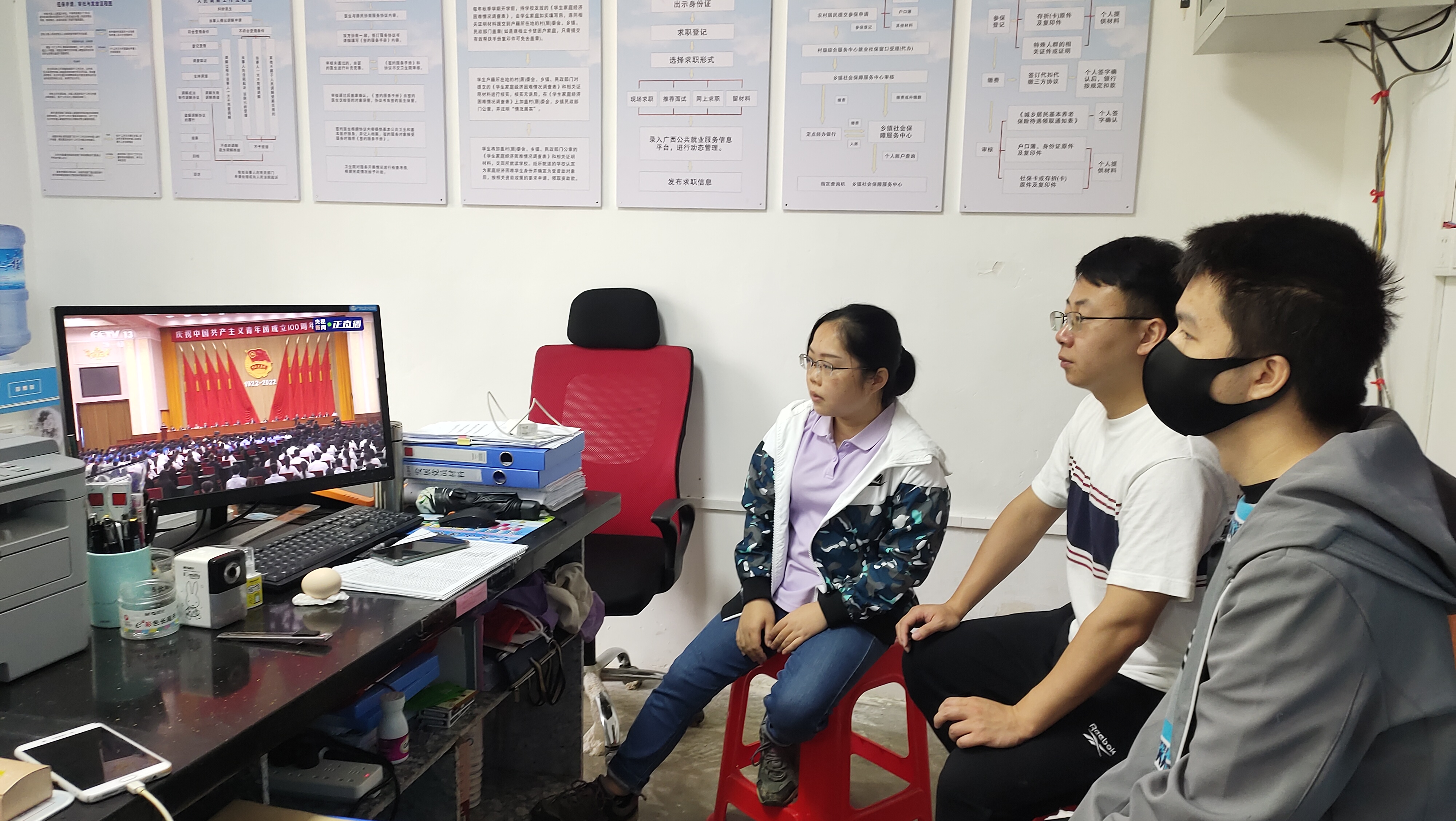 自治区档案馆团干部、团员青年和青年理论学习小组成员集中观看庆祝中国共产主义青年团成立100周年大会直播现场(丘革灵/摄)