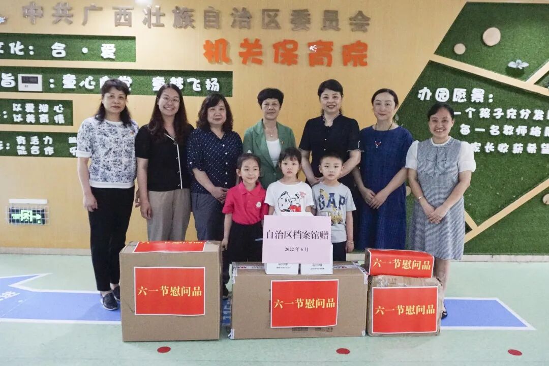 “六一”期间,自治区档案馆机关党委、工会、妇委会、团支部还组织了志愿者服务团队,到马山县白山镇定点帮扶村开展“粽情端午 一帮一联 与你童行”新时代文明实践暨关爱留守儿童志愿服务活动;到区党委保育院、区直机关第三幼儿园赠送书籍和学习用品,给孩子们送去节日的慰问和美好的祝福,祝愿所有的孩子能够健康快乐、茁壮成长。