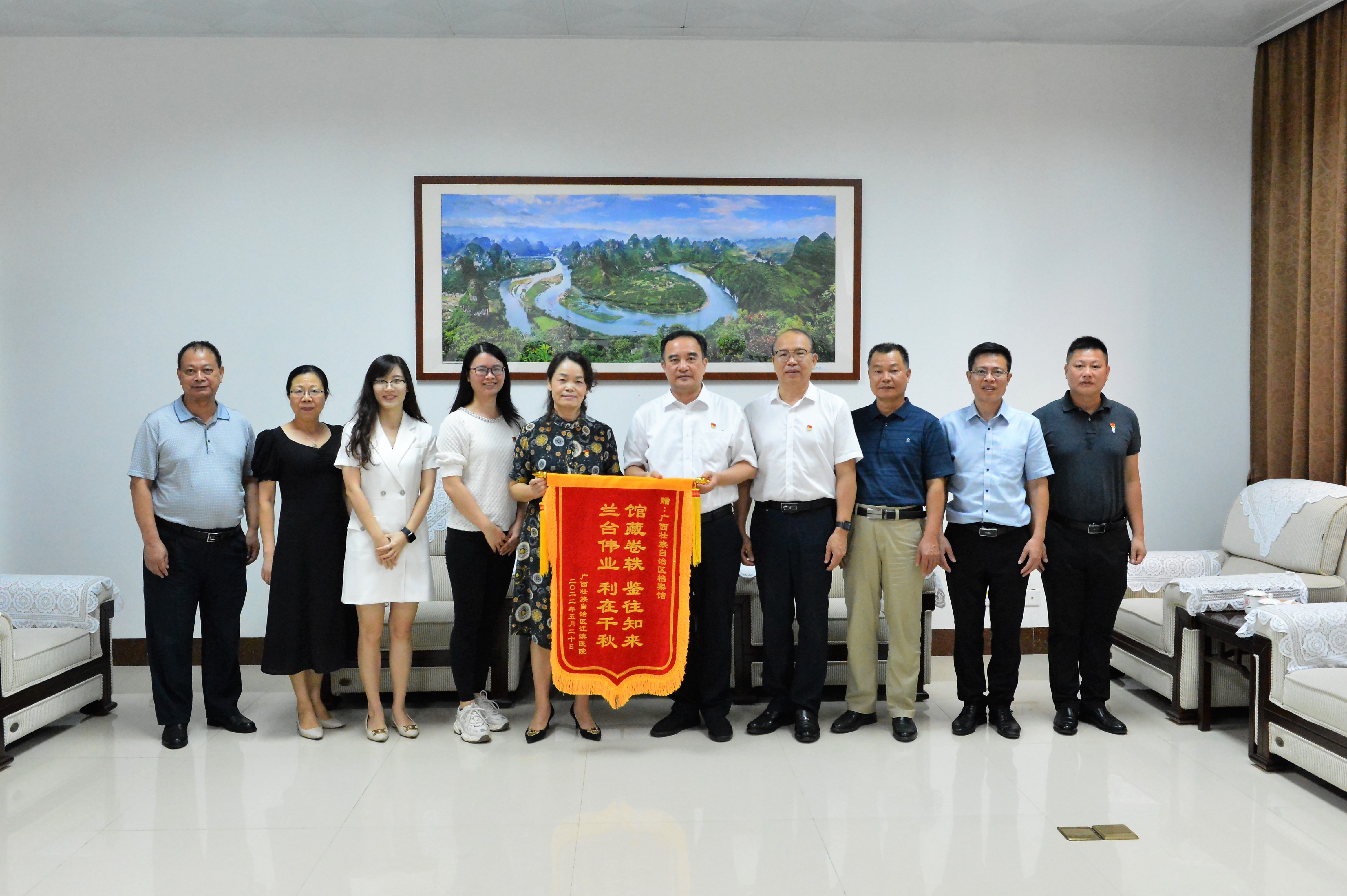 近日,广西江滨医院(自治区第三人民医院)党委副书记马金玉一行五人,来到自治区档案馆送锦旗和感谢信,对档案馆在该院利用档案建设院史馆过程中提供的服务表示感谢。