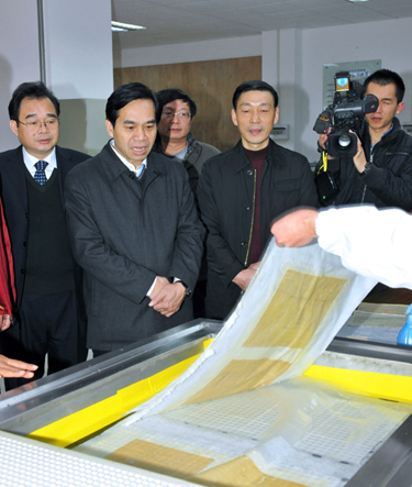 自治区党委常委、自治区常务副主席黄道伟(左2)、自治区政府副秘书长黄胜杰(左1),在自治区档案局馆长黄明初(左3)的陪同下,在自治区档案馆裱糊室调研